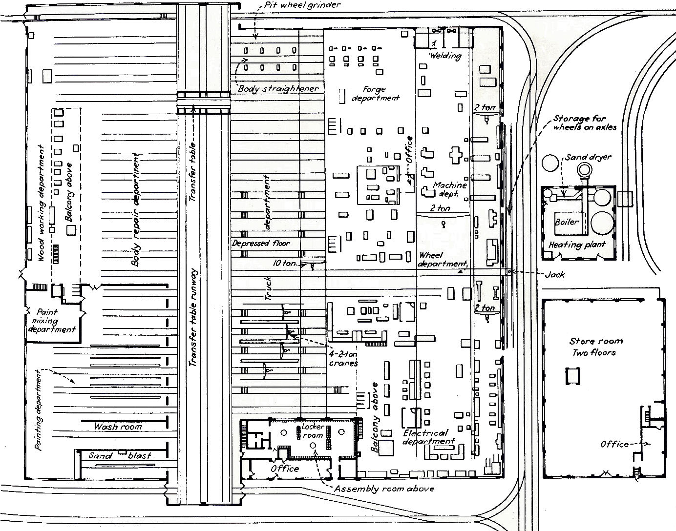 In the first image above you can see parts of Chester Park in the background. The large domed building near the center was Hilarity Hall. You can also see parts of the roller coaster. As you can see from the layout there were only two doors for cars to enter the building. One at the top and one on the bottom. The transfer table, running the full length of the building, would pick up each car and move it to what ever stall it needed to be sent to. Cars were scheduled to be overhauled every 60,000 miles. They would first enter the sand blast room where all paint was removed and it was cleaned inside and out. It would then go to the wash room and then to the truck repair department where the body would be lifted off the trucks and placed on light shift trucks and moved to the various departments to be worked on. The large storeroom building was connected to the main building by underground corridors. When repairs were completed the car would go thru the paint booth. This operation took three days. The wheels and axles for the trucks were stored in the basement and were raised and lowered by heavy duty elevators. After a complete inspection the cars were ready for duty.